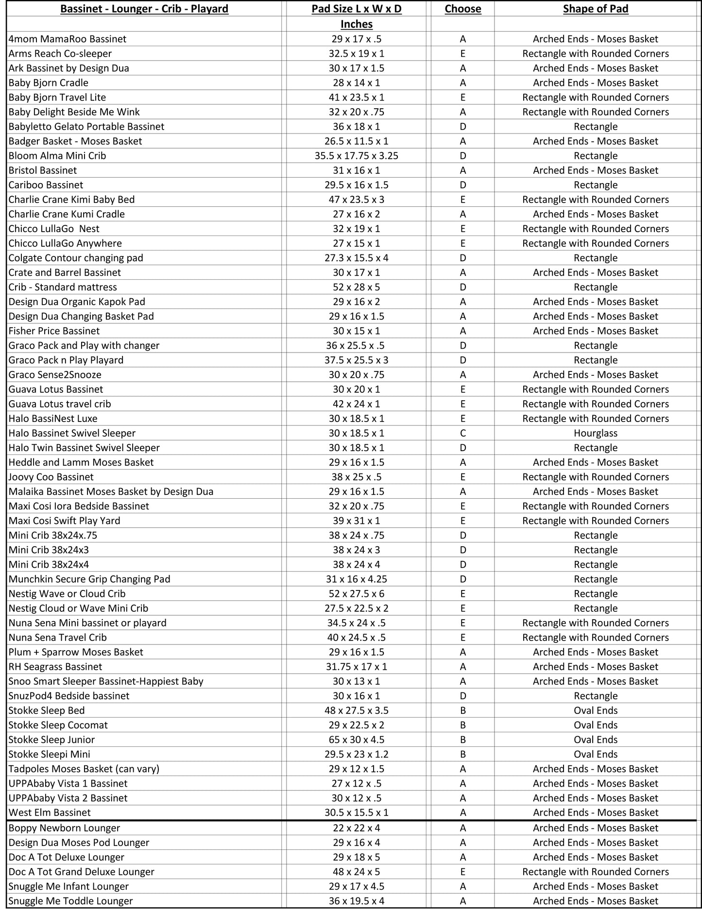 Our custom size and shape fit a number of different items, including: Moses baskets, bassinets, cradles and cribs. Take a look at the list of brands and models to fit your mattress pad just right!